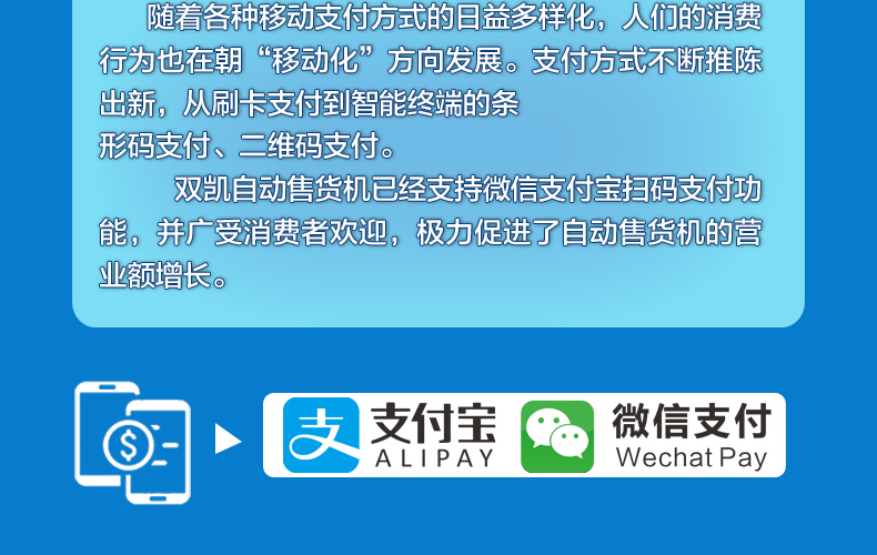 雙凱自動售貨機已經支持微信支付寶掃碼支付功能,并廣受消費者歡迎,極力促進了自動售貨機的營業額增長。